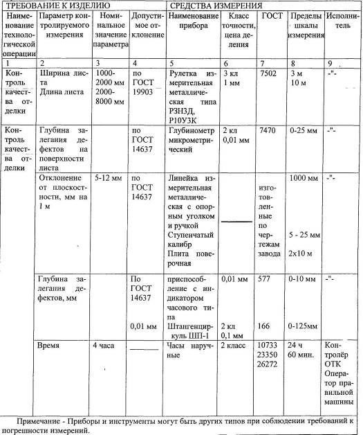 После охлаждения контролер ОТК производит осмотр листов с обоих сторон, замеряет толщину листов с учетом температурной усадки согласно таблице 11.4 и отмечает дефектные места.