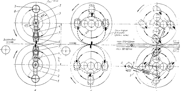 Вторая группа состоит из шести чередующихся клетей 530X900 мм с вертикальными 13и горизонтальными 14валками. При прокатке в этой группе можно получить заготовки сечением 120X120, 100ХЮО и 80X80 м (соответственно из 10, 12 и 14-й клети). Для того чтобы в девятую клеть задавать заготовку постоянной температуры, на промежуточном рольганге заготовка останавливается поднимающимся упором 10и выдерживается некоторое время на рольганге. Передний неровный конец заготовки обрезается маятниковыми летучими ножницами 11усилием 1,5 МН. В случае необходимости (по условиям калибровки валков) заготовка кантуется кантователем 12.