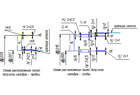Рис. Схема расположения полей допусков для калибра пробки и калибра скобы