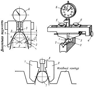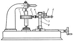 Рисунок 8.4—Схема контроля зубчатого венца биениемером: 1 — зубчатое колесо; 2 — оправка; 3 — наконечник; 4 — измерительный стержень; 5 — планка; 6 — наконечник индикатора; 7 — направляющая втулка. |
