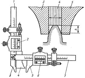 Рисунок 8.2 — Схема контроля хордовым зубомером: 1, 2 — шкала и нониус для установки прибора на размер hC ; 3, 5 — измерительные губки; 4 — упор, устанавливаемый на вершину зуба; 6, 7 — нониус и шкала для отсчета толщины SC