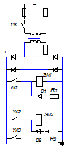 Для управления коробкой скоростей станка с ЧПУ применяются контактные электромагнитные муфты ЭМ…2 и бесконтактные электромагнитные муфты ЭМ…4. Применение таких муфт позволяет осуществлять переключение передач во время работы станка, как в холостом режиме работы, так и под нагрузкой [3]. Для питания электромагнитных муфт обычно применяются селеновые выпрямители. На рисунке 8 показана система питания группы электромагнитных муфт. Муфты включают и отключают по посредством управляющих контактов УК1, УК2 и т. д. При отключении муфты исчезающее магнитное поле наводит в её катушке э. д. с. Большой величины. Она может вызвать пробой изоляции катушки. Чтобы понизить э. д. с. нужно замедлить уменьшение магнитного поля. Это достигается применением резисторов R1, R2. Э. д. с. самоиндукции направлена в сторону убывающего тока; под ее действием по замкнутому через резистор контуру будет некоторое время протекать затухающий ток, который замедлит изменение магнитного потока и уменьшит величину э. д. с. Часто применяют вентили В1, В2. Они не пропускают тока через разрядные резисторы R1, R2, когда муфты включены, и в это время не будет потерь энергии в резисторах.