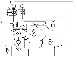 Для смазки данного станка принимаем комбинированную смазочную систему, которая состоит, из централизованной импульсной системы. Смазочный материал подается к каналам расположенных в нутрии валов под давлением, при этом происходит смазывание подшипников и охлаждение электромагнитных муфт. Смазка зубчатых передач осуществляется аэрозольным методом. Схема импульсной системы приведена на рисунке 9 состоящая из: 1 – указатель уровня смазочного материала; 2 – приемный фильтр; 3 – насос; 4 – фильтр напорной магистрали; 5 – манометр; 6 – смазочный дроссельный блок с ротаметрическими указателями; 7 – реле расхода смазочного материала; 8 – точки смазывания; 9 – указатель потока; 10 – точки смазывания с форсункой; 11 – точки смазывания; 12 – смазочный дроссельный блок; 13 – сливной магнитосетчатый фильтр; 14 – предохранительный клапан;15 – реле уровня; 16 – фильтр; 17 – резервуар.