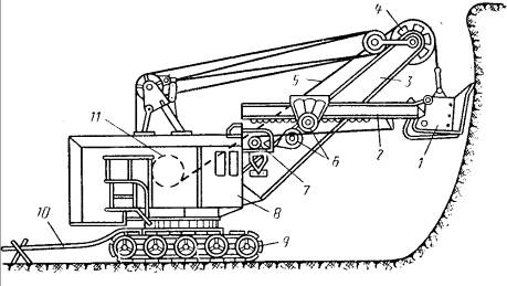 Экскаватор типа ЭКГ – 4,6 предназначен для разработки и погрузки горных масс в транспортные средства, находящиеся на одном уровне с экскаватором. Поэтому его оснащают только одним видом рабочего оборудования – прямой лопатой, состоящей из: ковша для черпания грунта 1; рукоятки 2, передающей закрепленному на ней ковшу напорное усилие, в результате чего зубья ковша врезаются в грунт; стрелы 3 с головным блоком 4 и подъемным канатом 5 для ковша, а также напорного механизма 6 и механизма открывания днища 7. Экскаватор имеет поворотную платформу 8 и ходовую тележку 9. Питание энергией осуществляется по силовому кабелю 10.