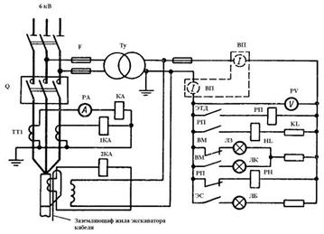 Энергия к экскаватору, находящемуся в забое, подводится гибким четырехжильным кабелем, подключаемым через передвижной приключательный пункт к внутрикарьерной линии электропередач на напряжение – 6 кВ. По трем жилам кабеля осуществляется питание электрооборудования, а четвертая жила служит для надежного заземления корпуса экскаватора.