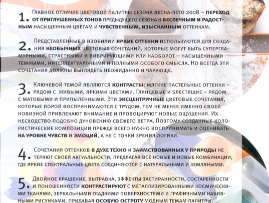 Кремовый с вкраплениями оттенков мела, белый, сизо-бежевый и телесный создают гармоничные сочетания, рождая полутона и слегка размытые тональные переходы от темного к светлому. Нанесенные на блестящие, переливающиеся или матовые поверхности, эти натуральные оттенки становятся более насыщенными. Напоминающие о минералах и каменных россыпях, как приглушенные, так и более яркие цвета выглядят особенно изысканно на мерцающих тканях с набивными рисунками в виде абстрактных пятен. Акценты: ржавые оттенки цвета бургундского вина и мягкие персиковые тона.