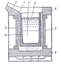 1 – жидкая сталь; 2‑шлак; 3 – водоохлаждасмая катушка индуктора; 4 – огнеупорная футеровка; 5 – сливной носок; 6 – огнеупорный кирпич; 7‑термоизоляция