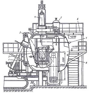 1 – механизм подъема и отворота свода; 2 – тигель; 3– индуктор; 4 – магнитопроводы (ферромагнитные экраны); 5‑кожух; 6 – сигнализатор; 7‑механизм наклона