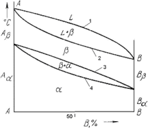 Шкала концентраций показывает содержание компонента В. Основными линиями являются линии ликвидус (1) и солидус (2), а также линии соответствующие фазовым превращениям в твердом состоянии.