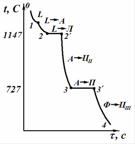 вторичного цементита. Аустенит при этом обедняется углеродом и при температуре 727 °С приобретает состав, соответствующий эвтектоидному. В точке 3 начинается эвтектоидное превращение аустенита в перлит при постоянной температуре 727 °С (площадка 3–3*).