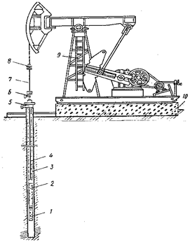 Штанговая глубинная насосная установка (рисунок 1) состоит из скважинного насоса 2 вставного или невставного типов, насосных штанг 4 , насосно-компрессорных труб 3 , подвешенных на планшайбе или в трубной подвеске 8 устьевой арматуры, сальникового уплотнения 6 , сальникового штока 7 , станка качалки 9 , фундамента 10 и тройника 5 . На приеме скважинного насоса устанавливается защитное приспособление в виде газового или песочного фильтра 1 .