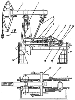 1 — подвеска устьевого штока; 2 — балансир с опорой; 3 — стойка; 4 — шатун; 5 — кривошип; 6 — редуктор; 7 — ведомый шкив; 8 — ремень; 9 — электродвигатель; 10 — ведущий шкив; 11 — ограждение; 12 — поворотная плита; 13 — рама; 14 — противовес; 15 — траверса; 16 — тормоз; 17 — канатная подвеска.