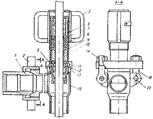 1 — ниппель; 2 — накидная гайка; 3 — втулка; 4 — шаровая крышка; 5 — крышка головки; 6 — верхняя втулка; 7 — нажимное кольцо; 8 , 10 — манжеты; 9 — шаровая головка; 11 — опорное кольцо; 12 — нижняя втулка; 13 — кольцо; 14 — гайка; 15 — тройник; 16 — болт откидной; 17 — палец.
