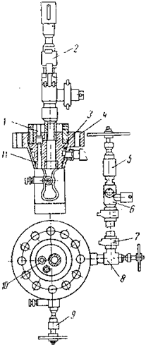 1 — отверстие для проведения исследовательских работ; 2 — сальниковое устройство; 3 — трубная подвеска; 4 — устьевой патрубок; 5 , 8 и 9 — угловые вентили; 6 — отборник проб; 7 — быстросборная муфта; 10 — перепускной патрубок; 11 — уплотнительное кольцо.