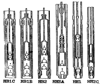 Скважинные насосы имеют вертикальную конструкцию одинарного действия с неподвижным цилиндром, подвижным металлическим плунжером и шариковыми клапанами. Насосы спускают в скважину на штангах и насосно-компрессорных трубах. Различают следующие типы скважинных насосов (рисунок 7).