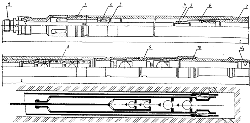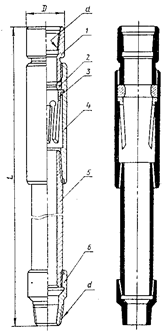 Замковая опора ОМ (рисунок 10) состоит из опорного кольца 2 , пружинного якоря 3 , опорной муфты 4 , кожуха 5 и переводников 1 и 6 .