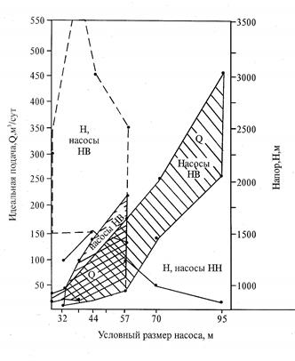 Применение насосов НН предпочтительно в скважинах с большим дебитом, небольшой глубиной спуска и большим межремонтным периодом, а насосы типов НВ в скважинах с небольшим дебитом, при больших глубинах спуска (рисунок 11). Чем больше вязкость жидкости, тем принимается выше группа посадки. Для откачки жидкости с высокой температурой или повышенным содержанием песка и парафина рекомендуется использовать насосы третьей группы посадки. При большой глубине спуска рекомендуется применять насосы с меньшим зазором.