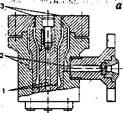 Для производства однослойных двухцветных рукавных пленок на том же агрегате его оснащают сменной экструзионной головкой, предназначенной для этих целей. Угловая кольцевая головка для производства однослойных двухцветных рукавных пленок (рис. 2,6) имеет два формующих полукольцевых канала 1 л 2 (1 — центральный кольцевой канал, 2 — наружный), по которым окрашенные в различные цвета расплавы направляются в выходной кольцевой зазор 3, где свариваются и откуда изделие в виде однослойного двухцветного рукава выходит наружу. Однако и в этом случае подобие вязкостных свойств используемых расплавов является необходимым условием переработки. Расплавы с одинаковыми вязкостными свойствами, контролируемыми таким технологическим параметром, как ПТР, можно получать, регулируя режимы переработки или состав полимерной композиции.