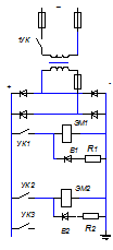 Для управления коробкой скоростей станка с ЧПУ применяются контактные электромагнитные муфты ЭМ…2 и бесконтактные электромагнитные муфты ЭМ…4. Применение таких муфт позволяет осуществлять переключение передач во время работы станка, как в холостом режиме работы, так и под нагрузкой [3]. Для питания электромагнитных муфт обычно применяются селеновые выпрямители. На рисунке 8 показана система питания группы электромагнитных муфт. Муфты включают и отключают по посредством управляющих контактов УК1, УК2 и т. д. При отключении муфты исчезающее магнитное поле наводит в её катушке э. д. с. Большой величины. Она может вызвать пробой изоляции катушки. Чтобы понизить э. д. с. нужно замедлить уменьшение магнитного поля. Это достигается применением резисторов R1, R2. Э. д. с. самоиндукции направлена в сторону убывающего тока; под ее действием по замкнутому через резистор контуру будет некоторое время протекать затухающий ток, который замедлит изменение магнитного потока и уменьшит величину э. д. с. Часто применяют вентили В1, В2. Они не пропускают тока через разрядные резисторы R1, R2, когда муфты включены, и в это время не будет потерь энергии в резисторах.