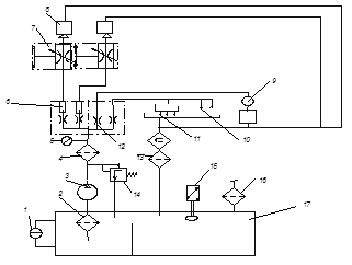 Для смазки данного станка принимаем комбинированную смазочную систему, которая состоит, из централизованной импульсной системы. Смазочный материал подается к каналам расположенных в нутрии валов под давлением, при этом происходит смазывание подшипников и охлаждение электромагнитных муфт. Смазка зубчатых передач осуществляется аэрозольным методом. Схема импульсной системы приведена на рисунке 9 состоящая из: 1 – указатель уровня смазочного материала; 2 – приемный фильтр; 3 – насос; 4 – фильтр напорной магистрали; 5 – манометр; 6 – смазочный дроссельный блок с ротаметрическими указателями; 7 – реле расхода смазочного материала; 8 – точки смазывания; 9 – указатель потока; 10 – точки смазывания с форсункой; 11 – точки смазывания; 12 – смазочный дроссельный блок; 13 – сливной магнитосетчатый фильтр; 14 – предохранительный клапан;15 – реле уровня; 16 – фильтр; 17 – резервуар.