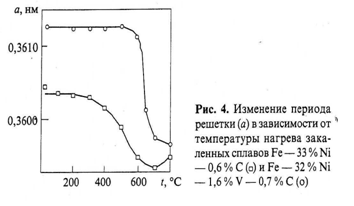 При изучении влияния термической и деформационной обработки на инварные и механические свойства сплавов Fе — Niи Fе — Ni— С выявили увеличение ТКЛР с повышением температуры нагрева до 500 °С. При более высоких температурах (выше 600 °С) ТКЛР уменьшается. Эти изменения обусловлены процессами перераспределения атомов железа, никеля и углерода. Увеличение ТКЛР в результате нагрева при темпера турах, близких к 500 °С, связано с процессами установления ближнего порядка атомов железа и никеля.