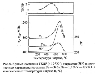 Процессы изменения атомно-кристаллической структуры при нагреве сплавов Fе — Ni— С — V при водят к изменению механических свойств (рис.4.2 ). Наибольший прирост прочностных свойств отмечается при нагреве в области температур 550 - 700 °С, когда наиболее активно протекают процессы атомного пере распределения и выделения мелкодисперсных фаз FезС и VC. Повышение более чем вдвое уровня значений прочностных свойств после нагрева до 600 - 650 °С сопровождается лишь незначительным изменением величины ТКЛР — не более чем на (0,5 - 1,0) • 1(Н К-1 (см. рис. 4.2).