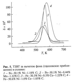 Релаксационные эффекты в инварном сплаве (-36% Ni), легированном углеродом, были изучены в герцовом диапазоне частот. Автором работы на кривых ТЗВТ был выявлен максимум при температуре 473 К, который является суперпозицией пика Финкельштейна—Розина и магнитодиффузионного пика, последний из которых устранялся наложением магнитного поля напряженностью 250Э.