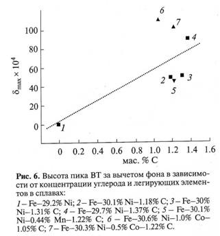 Не исключается также другой механизм, заключающийся во вкладе в релаксацию непосредственно одиночных атомов С, которые в паре с одним из легирующих элементов или вакансий, созданных закалкой, образуют соответствующие диполи, вращение которых под воздействием упругих напряжений порождает ВТ.
