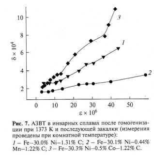 Под инварными аномалиями физических свойств подразумеваются малые значения температурного коэффициента линейного расширения (ТКЛР), положительные или нулевые величины температурных коэффициентов модулей упругости, большие положительные значения спонтанной магнито-стрикции и магнитострикции парапроцесса, значительное уменьшение температуры магнитного упорядочения и намагниченности под действием давления и т.д. В инварах эти параметры, как правило, по абсолютной величине на порядок больше, чем у обычных ферромагнетиков [2].