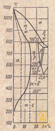 Диаграмма, показывающая фазовый состав и структуру Cu - Sn-сплавов (оловянистых бронз). Представляет собой комбинацию нескольких перитектических диаграмм. Возможно образование следующих фаз: α - твердый раствор Sn в Cu; Sn - почти чистое олово (растворимость Cu в Sn меньше 0,01 %); β - твердый раствор электронного типа на базе соединения Cu5 Sn, а пунктирная линия показывает процесс его упорядочения; δ - электронное соединение Cu31 Sn8 ; γ- твердый раствор на базе химического соединения Cu и Sn; ε - электронное соединение Cu3 Sn; η - химическое соединение Cu6 Sn5