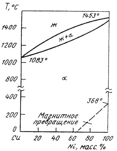 Диаграммасостояния Сu—Ni характеризуется образованием в процессе кристаллизации непрерывного ряда твердых растворов (Сu, Ni) с гранецентрированной кубической структурой. Установлено равновесие Ж ↔ Газ с азеотропным минимумом при температуре 2500 °С и концентрации 50—60%(ат.)Ni; указывается на наличие области расслоения на две фазы (газообразный и жидкий растворы разного состава) при концентрации 60—100 % (ат.) Ni. В интервале концентраций 0-60%(ат.) Ni область расслоения настолько узка, что практически вырождается в прямую линию.