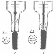 Таким чином, довжина градусного інтервалу шкали термометра прямо пропорційна об`єму термометричної рідини (приблизно об`єму резервуара), видимому коефіцієнтові розширення рідини β і обернено пропорційна поперечному перерізу каналу капіляра S) Чим більша довжина градусного інтервалу, тим на більше число поділок може бути розділений градус і тим менша ціна розподілу і відповідно вища чутливість термометра і його точність. Як випливає з формули (2), при фіксованій довжині шкали L збільшення довжини градусного інтервалу може бути досягнуто лише при відповідному зменшенні діапазону шкали tк – tп термометра. Найбільш точні і високочутливі скляні ртутні термометри виготовляються з ціною розподілу 0,01-0,02 град і діапазоном шкали від 4-5 до 8-10о С. Для цих термометрів характерний великий об`єм резервуара і малий діаметр каналу капіляра. Однак мінімальна величина перетину каналу і максимальний обсяг резервуара обмежені певними межами.