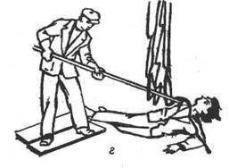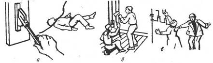 Рис. 7 - Способи звільнення потерпілого від дії електричного струму: а - відключення електричного струму; б - обривши електричних проводів; в - відтягання потерпілого; г - видалення проводу, що знаходиться під напругою, від людини
