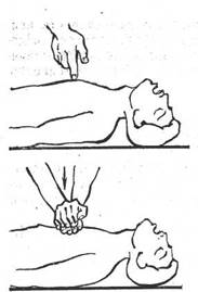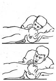 Найбільш тяжкі наслідки дії електричного струму - зупинка дихання і серцевої діяльності. Якщо відсутнє подих, але прощупується пульс, приступають до проведення штучного дихання. Якщо ж відсутній і серцебиття, то поряд зі штучним диханням проводять зовнішній масаж серця (мал. 8). Ефективним і доступним способом проведення штучного дихання є вдмухування повітря в легені потерпілого через рот і ніс (мал. 9). Потерпілого укладають на спину, відкривають йому рот, якщо необхідно, витягають запала мова і закидають голову назад, підкладаючи під лопатки валик або згорток одягу. Очистивши порожнину рота від слизу, затискають ніс потерпілого і на його ніс і рот накладають суху носову хустку або марлеву серветку. Зробивши 2...3 глибоких вдихи, що робить допомогу вдмухує повітря в рот потерпілого. Частота штучного дихання відповідає ритмові природного дихання (12-14 разів у хвилину); тривалість його різна - до відновлення ритмічного дихання в потерпілого.