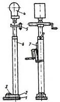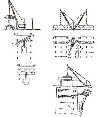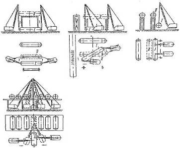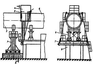 Схему 2 применяют при невозможности заезда крана между фундаментами аппарата; схему 2а - при установке аппаратов на низкие фундаменты, при этом кран необходимо передвигать на новую стоянку после установки по одному аппарату в каждом ряду. При установке аппаратов по схеме 2б необходимо следить за тем, чтобы стрела крана не соприкасалась с постаментом, а зазор между ними не превышал 0,2 м. Для предотвращения соприкосновения поднимаемого аппарата с расположенными рядом конструкциями и стрелой крана к днищам аппаратов закрепляют оттяжки из пенькового каната, с помощью которых аппарат направляют в процессе подъёма.