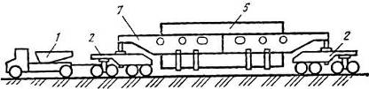 1-тягач; 2-базовые тележки; 3-гидродомкраты; 4-консоли; 5-блок; 7-платформа колодцеобразного типа
