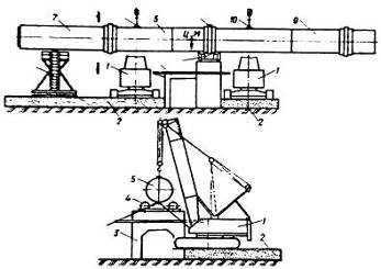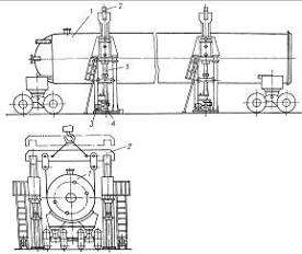 Вращающиеся барабанные печи относятся к типу горизонтальных аппаратов. Горизонтальные аппараты могут быть смонтированы одним или спаренными кранами. Способ подъема и грузоподъёмность кранов выбирается в зависимости от размера и массы аппарата, высоты и конфигурации фундамента или постамента под аппарат, наличия расположенных рядом строительных конструкций и смонтированного оборудования. Основные схемы подъёма горизонтальных аппаратов одним стреловым краном приведены на рис. 1 схемы 1а и 1б применяют в том случае, когда возможен проезд крана между фундаментами монтируемого аппарата. Наиболее целесообразно уложить аппарат перед подъёмом в положение, близкое к проектному 1а таким образом, чтобы центр его тяжести находился на одной вертикали с грузоподъёмным полиспастом крана, а грузоподъёмность крана на данном вылете стрелы соответствовала массе поднимаемого аппарата.