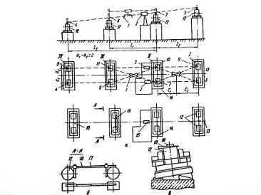 На рисунке 2 а , показаны наиболее благоприятные условия работы кранов при монтаже аппаратов на любую высоту в пределах характеристики кранов. На рисунке 2о, показан монтаж, когда установка одного из спаренных кранов с внешней стороны фундаментов невозможна. В этих случаях монтаж аппаратов производится только маневрированием стрелы крана. На рисунке 2 в , показан подъём аппаратов при невозможности расположения кранов с внешней стороны фундаментов и проезда между фундаментами. В этом случае монтаж аппаратов производится за счёт увеличения вылета стрелы кранов или перемещения кранов с поднятым аппаратом в пределах грузовой характеристики кранов.