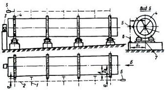 Барабанные вращающиеся печи, применяемые в химической промышленности для обжига твердых веществ, представляют собой стальной цилиндрический кожух, длиной до 180 м., футерованный изнутри огнеупорными материалами. Вес печи достигает сотен тонн. На кожух печи надето два или несколько бандажей, посредством которых он опирается на ролики. Печь приводится во вращение от электродвигателя через привод, подвенцовую и венцовую шестерни. Печь устанавливается под углом 2-3 к горизонту. Основными требованиями, предъявляемыми к смонтированной барабанной печи, являются: прямолинейность продольной оси печи, лёгкость её вращения, наличие проектных зазоров для компенсации теплового расширения между бандажами и корпусом печи, отсутствие биения корпуса печи и зубчатого венца при вращении печи, отсутствие тенденции к смещению печи вдоль продольной оси при её вращении, надёжное уплотнение в листах примыкания концов барабана печи к неподвижным частям (особенно в тех случаях, когда при работе печи выделяются вредные газы)