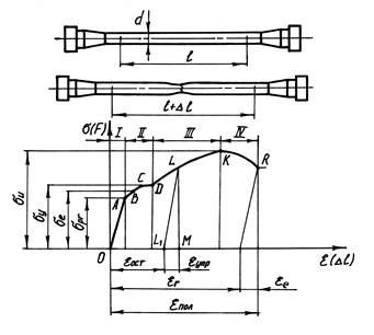 Наибольшее распространение имеют испытания на растяжение статической нагрузкой, так как они наиболее просты и дают достаточную информацию о поведении материала при других видах деформации. На специальных машинах растягивают образцы (рис. 1, а), размеры которых ограничены стандартом, записывая автоматически зависимость изменения растягивающей силы F от удлинения образца Δℓ , т.е. диаграмму растяжения в координатах F = f(Δℓ).