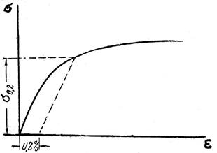 При дальнейшем увеличении нагрузки за точкой В появляются остаточные деформации. В точке С начинается процесс деформации металла без увеличения внешней нагрузки. Горизонтальный участок диаграммы называется площадкой текучести, а напряжение, соответствующее данной точке, – пределом текучести (σ y ). Ряд материалов дает при растяжении диаграмму без выраженной площадки текучести (рис 5.9). Для таких материалов пределу текучести σ y соответствует напряжение, при котором остаточная деформация равна 0,2% . Поэтому иногда предел текучести обозначают σ 0,2 и называют условным пределом текучести .
