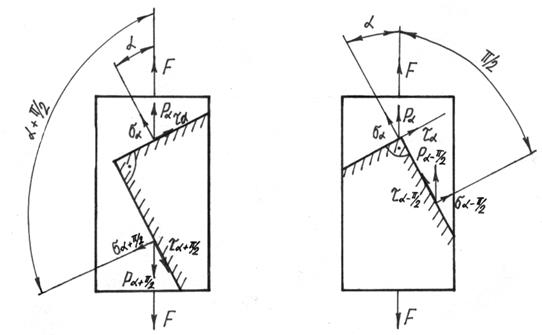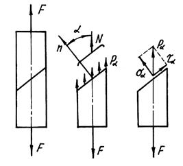 Для оценки прочности деталей рассмотрим напряжения, действующие по любому сечению растянутого (сжатого) стержня. Нормальные напряжения σ в поперечном сечении считаем известными. Возьмем сечение, наклоненное под углом α к поперечному сечению. Площадь наклонного сечения равна