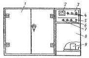В состав стенда входят прибор, испытательный столик и кабели. Прибор состоит из панели и корпуса. Испытательный столик - из столика, привода командоаппарата и кронштейна. Испытательный столик предназначен для установкипроверяемых командоаппаратов и программных устройств. На панели размещены эталонные программные устройства автоматических стиральных машин «Эврика-автомат», «Вятка-автомат», «Волга- 10» и «Кишинэу», реле времени, электромагнитные реле, трансформатор, переключатели, кнопки, элементы звуковой и световой сигнализации, плата, выпрямитель. Работа стенда по проверке программных устройств основана на реализации логической схемы отрицания разнозначности.