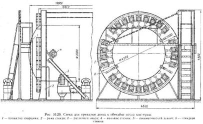 Поэтому такие способы можно рекомендовать только для мелкосерийного и серийного производств. Общую сборку обечайки с днищами выполняют на механизированном стенде, где обеспечиваются быстрое совмещение и прижатие стыкуемых поверхностей.