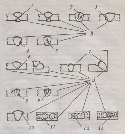 1 – непровар; 2 – трещины; 3 – несплавления; 4 – шлак; 5 – поры; 6 – непровар; 7 – подрезы; 8 – трещины; 9 – поры; 10 – наплыв; II – шов неравномерной формы; 12 – прожог; 13 – кратер