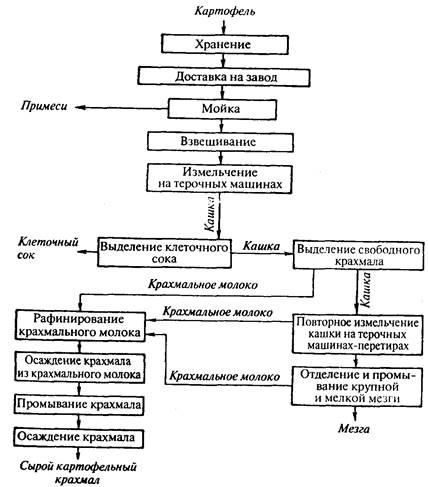 Принципиальная технологическая схема получения сырого картофельного крахмала (рис. 1) состоит из следующих этапов: хранение картофеля; доставка картофеля на завод; мойка , картофеля; взвешивание картофеля; тонкое измельчение картофеля — получение кашки; выделение картофельного сока из кашки; выделение свободного крахмала из кашки; отделение и промывание мезги; рафинирование крахмального молока; промывание крахмала.
