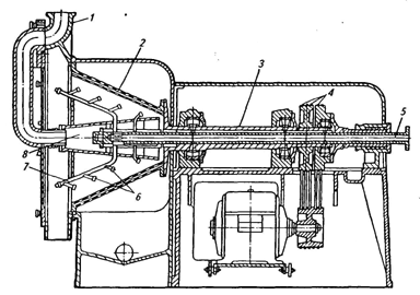 Кашка подается через трубу 1 и питатель 8 в вершину ситового конуса. Барабан вращается с частотой 900 с-1. Под действием центробежной силы кашка равномерно распределяется по внутренней поверхности барабана и продвигается к большему его основанию. Навстречу движению кашки подается вода или жидкое крахмальное молоко через вал 5, который вращается внутри вала 3. Струйный ротор-ороситель состоит из коллектора 7 и разбрызгивающих сопел 6. Привод 4 обеспечивает опережение вращения ротора-оросителя на 50 с-1 по сравнению с частотой вращения барабана 2. Вода под давлением 0,2...0,25 МПа образует против движения кашки водяной шнек, задерживающий ее продвижение по ситу и способствующий отмыванию свободного крахмала.