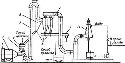 Сушка крахмала. Крахмал сушат в сушилках различных систем, используя в качестве теплоносителя подогретый воздух. Наибольшее распространение получили пневматические сушильные установки ПС-15 (рис.3), в которых обеспечивается хороший контакт крахмала с теплоносителем. Так как процесс сушки протекает очень быстро, сушилки получили название сушилок мгновенного действия. Обезвоженный на центрифугах крахмал через смеситель-питатель 4 поступает в рыхлитель 3, где смешивается с горячим воздухом, предварительно очищенным в фильтре 1 и подогретым в калорифере 2. За счет вакуума, создаваемого вентилятором, крахмаловоздушная смесь поднимается в трубу 5, где происходит высушивание. Недосушенные комочки крахмала возвращаются в смеситель-питатель -/через карман 6. Высушенный крахмал осаждается в аэроциклонах 7 и через шлюзовые затворы 8 поступает в сборный шнек 9 и бурат 10, транспортирующий воздух очищается в скрубберах 11 и удаляется из сушилки. Отделка сухого крахмэлз Из сушилки крахмал выхолит температурой 55...60 °С и подается в специальный бурат-охладитель. Охлажденный крахмал поступает в бункер-смеситель, а затем в центробежный бурат для разрушения основной массы комочков крахмала, образовавшихся в процессе сушки. Далее крахмал просеивается в призматическом бурате и поступает на фасование. Сходы с буратов (неразрушенные комочки крахмала) направляют в мельницу для измельчения и последующего просеивания. Этот крахмал оценивается уже как крахмал II сорта. Полученный сухой картофельный и кукурузный крахмал должен отвечать требованиям соответствующих ГОСТов.
