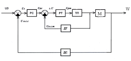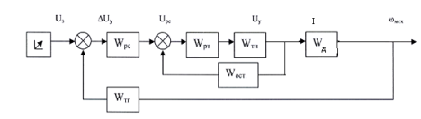 Для статического и динамического расчета САУ необходимо составить структурную схему, на которой все элементы системы нужно представить их передаточными функциями. Это двигатель, ТП, регуляторы, датчики обратных связей (рисунок 6).