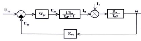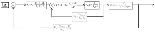 Регулятор скорости организован по пропорциональному принципу (П) закону управления с настройкой на модульный оптимум. Регулятор для обеспечения требуемых динамических параметров должен компенсировать электромеханическую постоянную времени системы Тм , а также малую постоянную времени контура скорости Тос (рисунок 6).